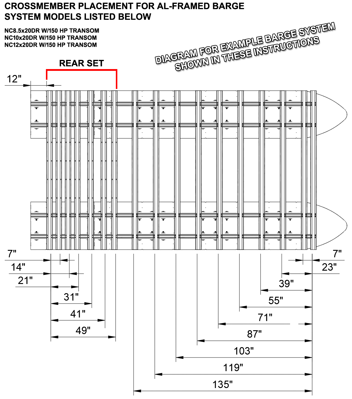 If you purchased a transom system with your barge kit, your diagram will state "Rear Set" for the rearmost 5 to 7 crossmembers. These crossmembers will have holes pre-machined for mounting your transom system and go at the rear of the boat. Please note that some dual-row pontoon systems (2 pontoon assemblies) have the "Rear Set" crossmembers placed ahead of the end of the pontoon assembly Main Beams. This is intentional in our design and helps balance the completed vessel. If you are building a triple-row barge (tri-toon) with our large transom, there will also be a "FRONT Rear Set" crossmember (see example diagram here). This crossmember both attaches to the front of your transom droip-brackets and the center pontoon assembly. If you did not purchase a transom system for your barge kit, every crossmember is identical. |