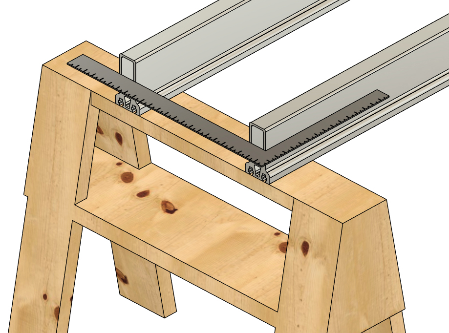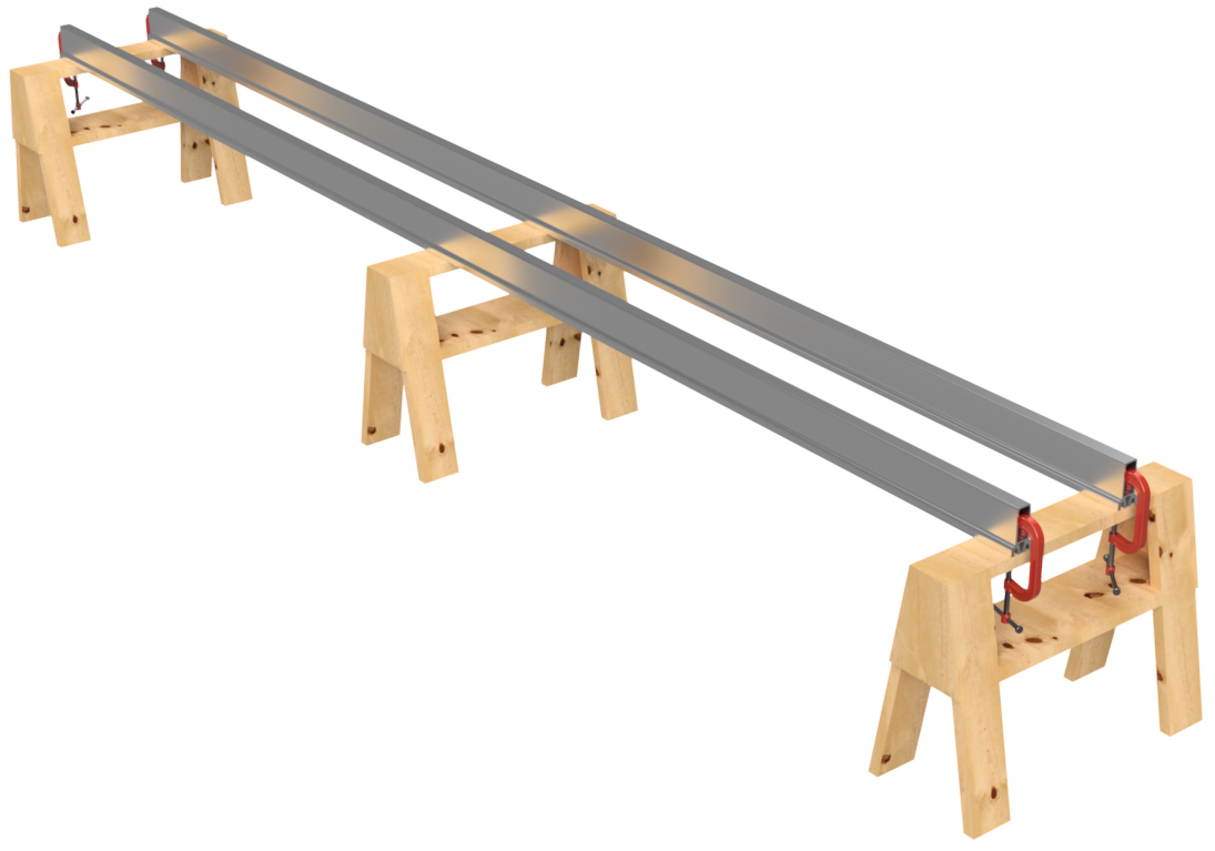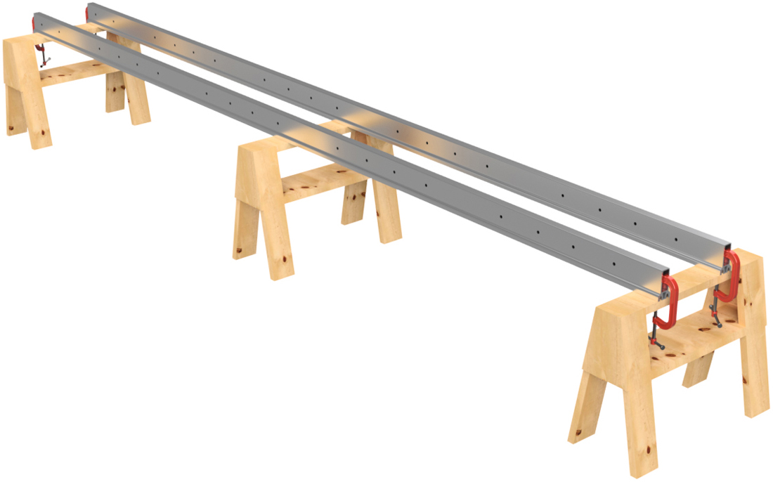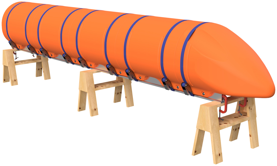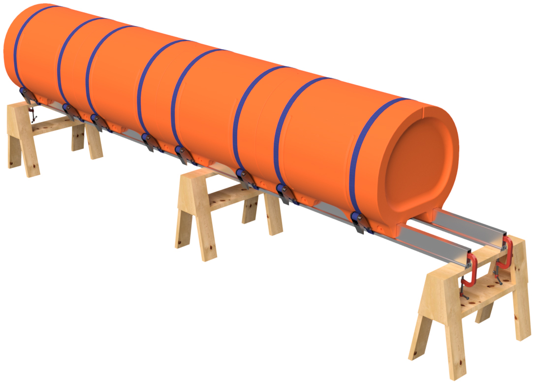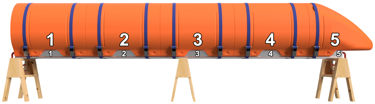Remove the ratchet straps. Before removing the floats, number the positions of the floats on the Main Beams as shown. Number the floats and Main Beams on both sides of the pontoon assembly. For instance, if you're building a 20' long pontoon, you'll want to label position 1, 2, 3, 4, and 5 on one side and 6, 7, 8, 9, and 10 on the other. This ensures that you don't mix up the positions of the floats after you drill holes. You can use a piece of masking tape to write on or you can use a marker to write on the floats and Main Beams. If using a marker, lacquer paint thinner will remove the ink after assembly, and the paint thinner will not hurt the plastic or the aluminum. Remove the floats and unclamp the Main Beams from the saw horses.