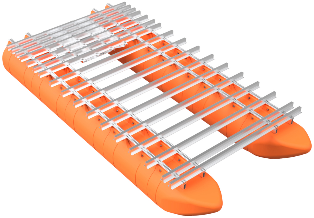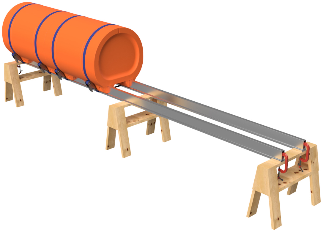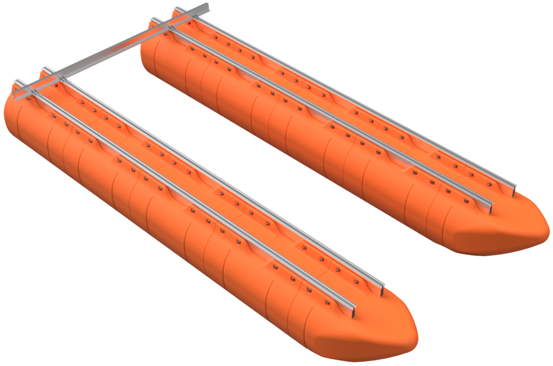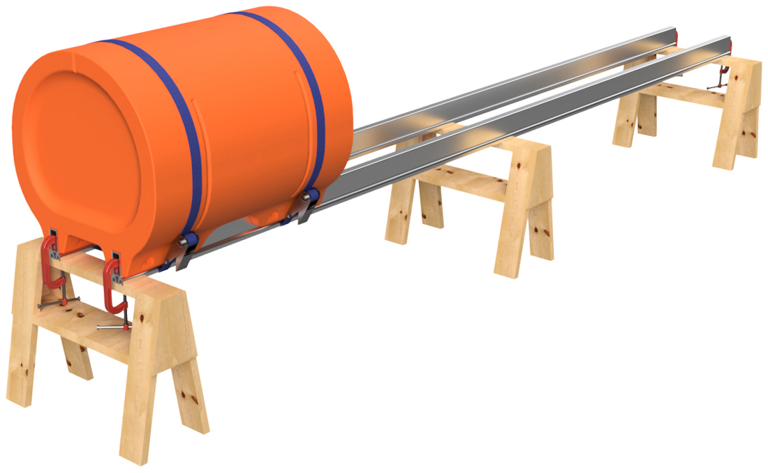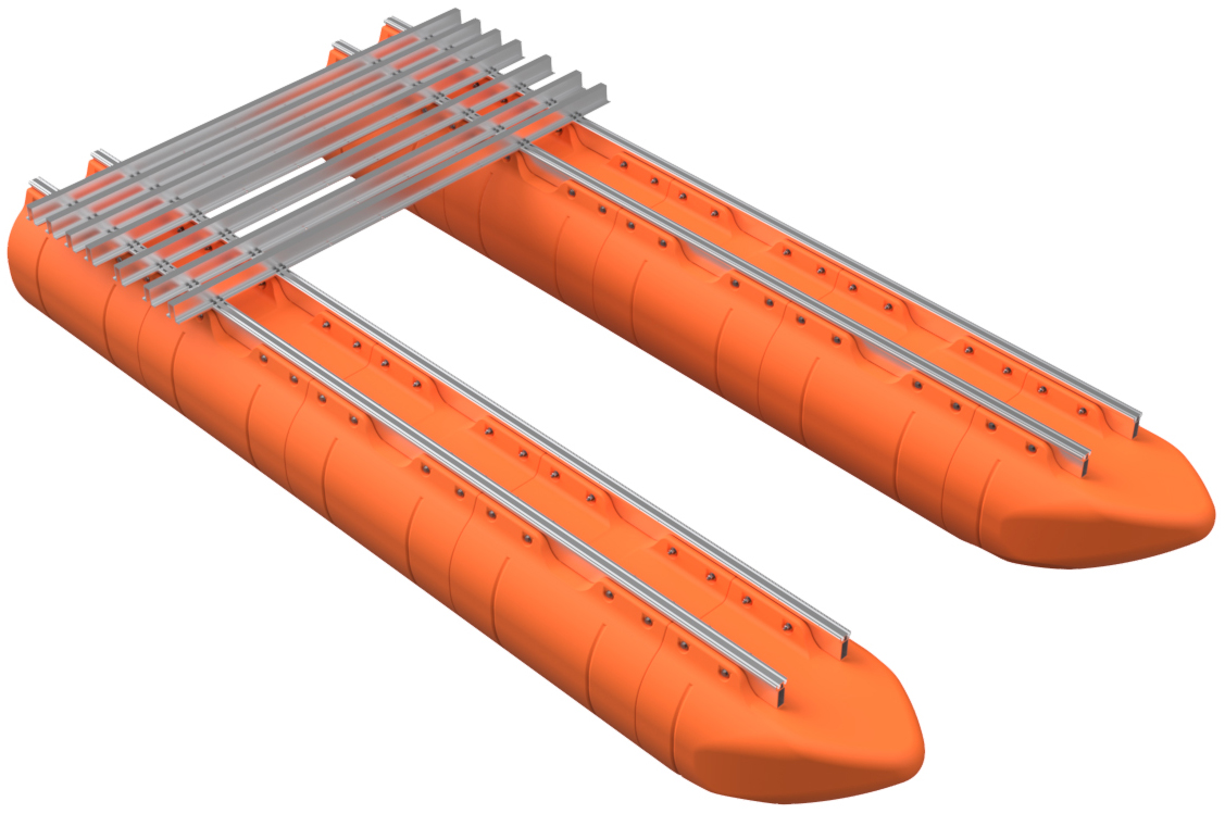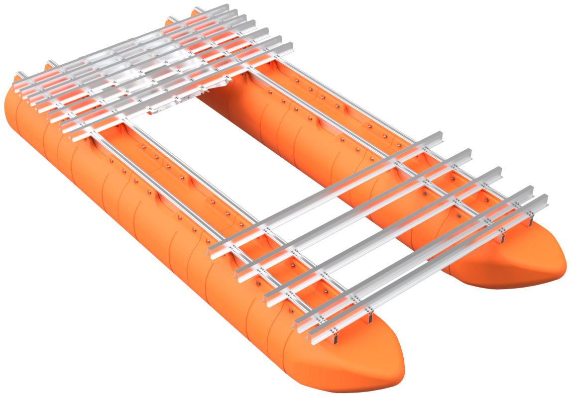 The pontoon and frame system assembly for our full aluminum frame large barge sytems with 36" floats is simple in concept and requires basic tools, a few specific tools, proper lifting equipment, and at least a 2-person team to complete safely. Even our shortest large barge system has pontoon assemblies that land at almost 700 pounds each, so this large-scale system requires a forklift or other lifting equipment to safely assemble pontoons and then move the completed vessel. Failure to be properly equipped for the task of assemby can cause risk of bodily harm, for which Tiny Pontoon Boats is not responsible. Don't underestimate the scale of what you are about to build! As our website states, you're building a Big Ass Pontoon Boat!