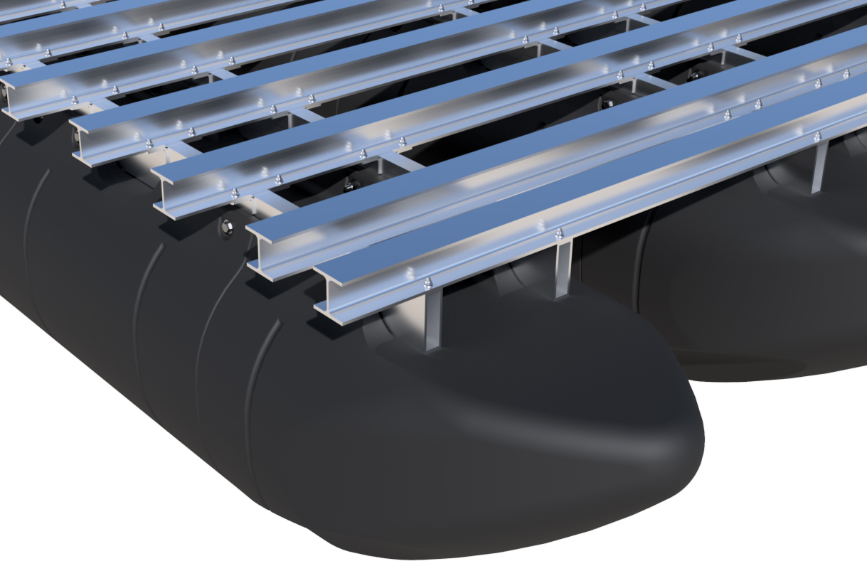 1. This tip applies to folks who are using "sharp corner" 6"x2" rectangular tube for your Main Tubes. If you are able to use the "radius corner" tubing for your barge, this tip does not apply. Before mounting your Main Tubes to your floats, we recommend running a wood-working router with a "corner rounding" bit (1/8" radius or smaller) down the bottom edges of the tube. This stops "sharp corner" tube from digging into the floats over time. 2. We recommend following Step 1-12 of our Full Aluminum Frame System instructions (frame option A) when mounting the pontoons themselves. When reading through the instructions, replace "Main Beam" with your "Main Tube weldments". The rest is the same. Those instructions are listed here: READ THROUGH STEP 1-12 OF FULL ALUMINUM BOLT-TOGETHER FRAME SYSTEM 3. If you need to splice your Main Tubes, you'll need gusset plates for either side of your butt-joints. Here's a CAD file for the gusset plate design that we like for this application. Bear in mind that you'll want to have this plate centered in a recess of a float's mounting channels (centered on a float) and you'll want to space it about 3/4" up from the base of the butted tubes. Also, this gusset plate requires beefy welds all the way around. RECOMMENDED GUSSET PLATE CAD MODEL 4. For the love of Pete, don't ask us for full instructions for this frame concept as we won't provide them as we do for the frame systems that we do sell. What we are providing here is all free information for a system that we are not making a dime on! We will not provide full designs and we will only provide verbal advice from this point forward regarding this expert-level, DIY frame concept. If you're not actually an expert-level fabricator, we recommend sticking with the "Option A" frame system that we offer. 5. Take a good solid look at an example barge system that we have designed with this frame concept to see how it all comes together. We have a 3D viewer and the full CAD model available to download for a 12'x32' triple-row barge system at the link below. |